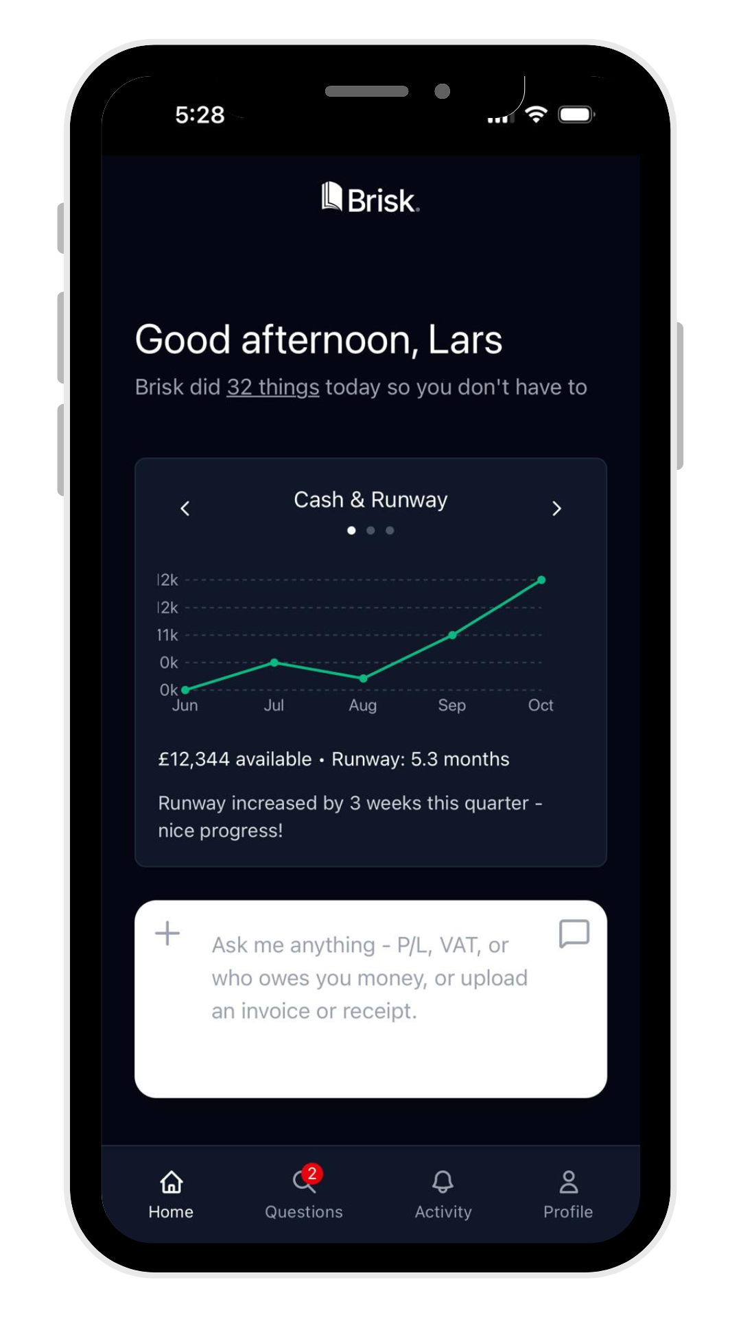 Brisk App is your accountant who works 24/7. Your cash, burn, and margins update continuously.